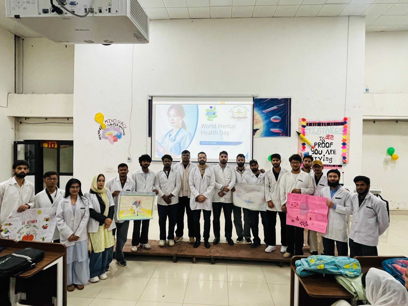 As part of the event, MBBS pre-final year students, Ms. Sarosh and Ms. Mitali delivered an informative presentation on mental health, focusing on coping mechanisms and the significance of accessible services. A poster presentation was also organised, where students creatively depicted themes related to mental health awareness and the role of healthcare professionals in supporting affected individuals.